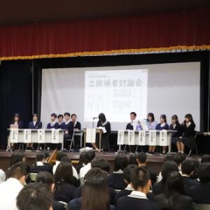 10月29日(水曜日)6限、全校生徒が講堂に集まって、生徒会役員選挙(11月5日実施)にむけての「立候補者討論会」を開催しました。