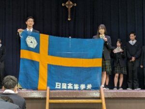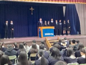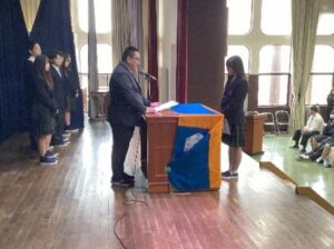 11月7日(金)には講堂朝礼(全校集会)で、役員任命式を実施。任命状の授与の後、新旧の役員の引継ぎを行いました。