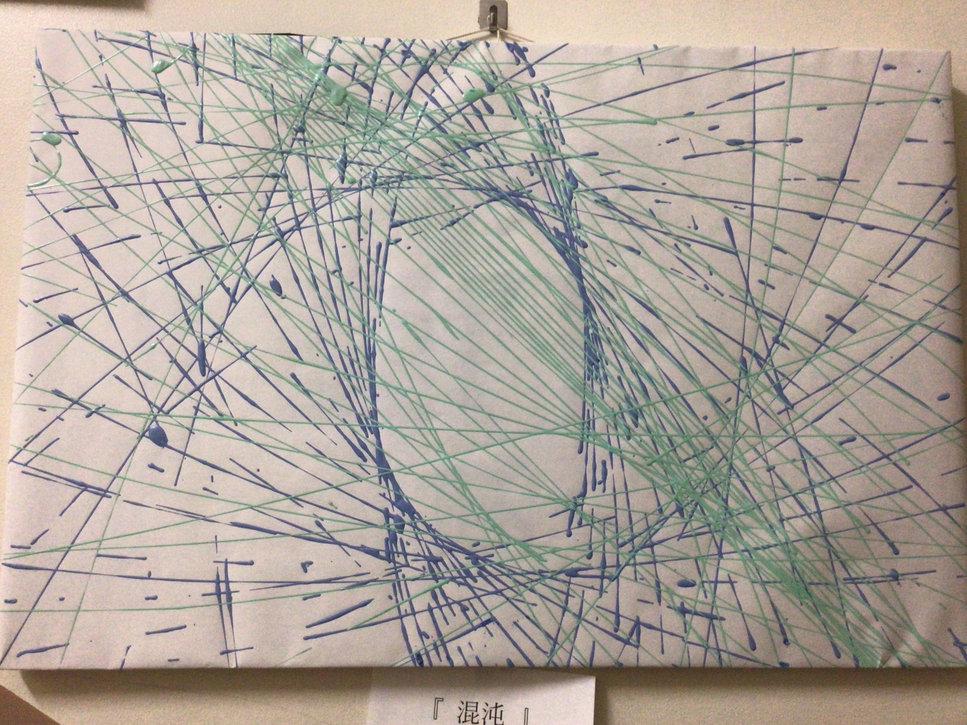 ペンデュラムアート(Pendulum Painting)とはインクの入ったボトルなどをひもで吊り下げて、楕円を描くように振り子にして回して、遠心力と重力で、軌道上にインクを垂らし曲線を描くもので「世界一美しいアート技法」と呼ばれるもので、部活で参考にしている動画チャンネルを見ているときに、みんなでやってみたいということでやってみました。