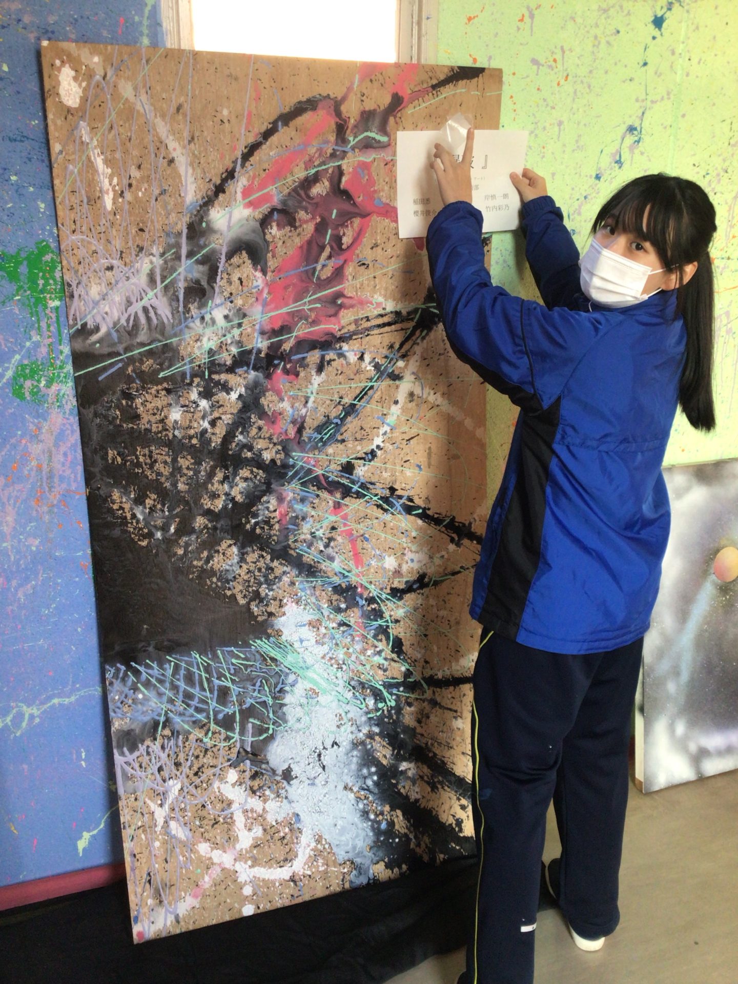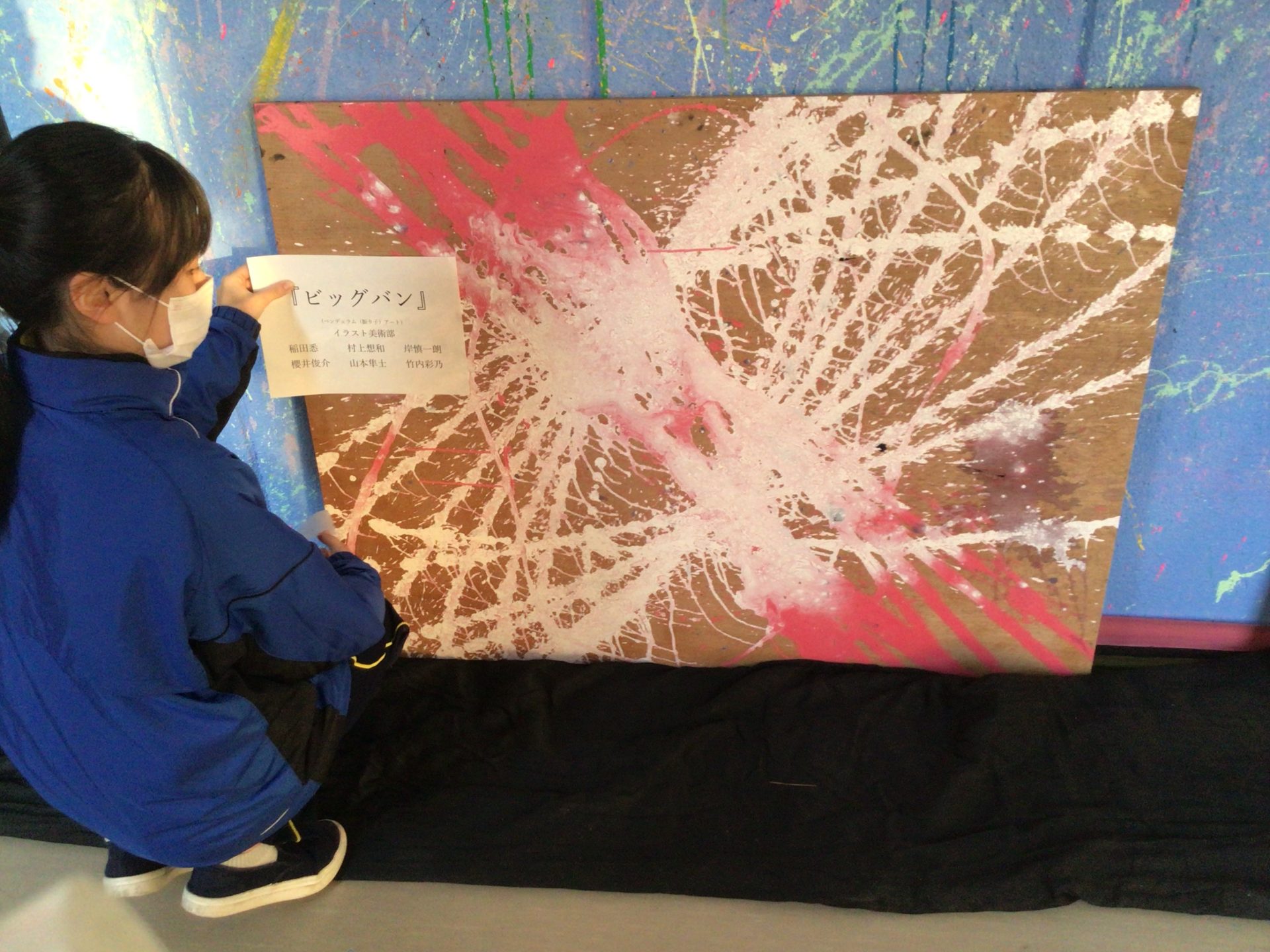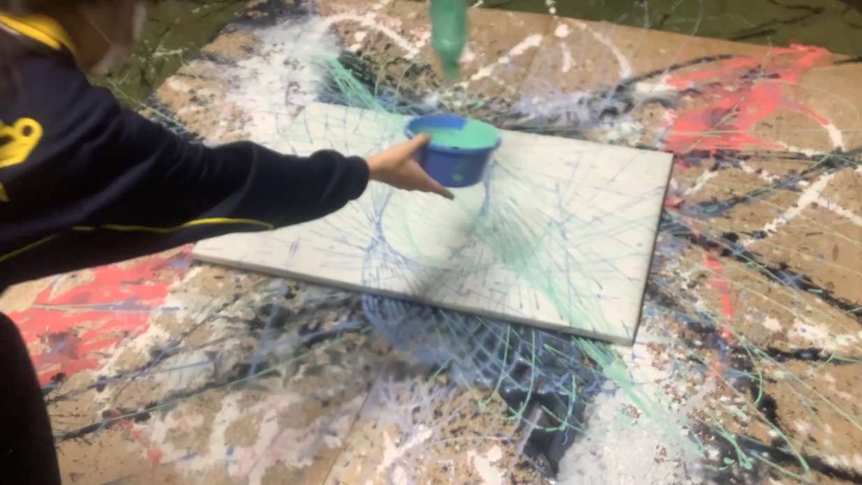 ペットボトルに絵の具やペンキを入れて、大小さまざまなキャンバスに色を付けていきましたが、「絵の具にもっと水がいるかも」「インクのでる穴をもっと大きくして」「ヒモは長い方がいいのかな」「もっと静かに投げるように手を離してみて」とか、みんなで色々試行錯誤しながら、絵の具まみれになりつつ挑戦してみましたが、思っていた以上に綺麗な作品や抽象的なものなど、すごい良い作品が沢山できあがり、2学期最後にみんなで楽しくできたことに大満足のようでした。