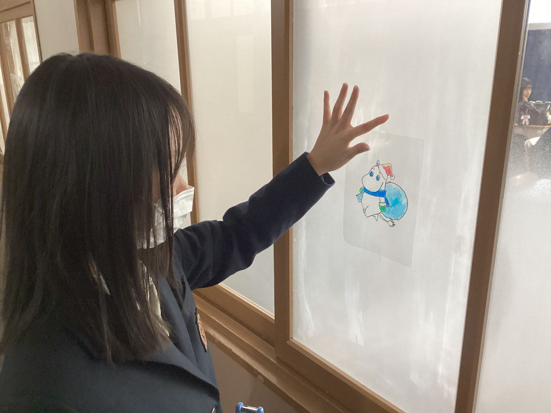 プラ板にマジックでクリスマスやみんなが笑顔になりそうな絵を描いて、簡単ステンドグラスを作りました。