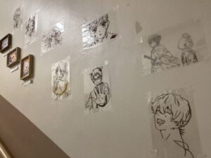 また、簡単ステンドグラス作りがちょっと楽しくなって、クリスマスとは関係ないイラストも描いたので、それは廊下の壁に飾りました。