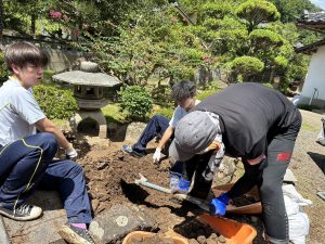 本校ではメールにて生徒にボランティアを呼びかけたところ、夏休み中にもかかわらず12名の生徒が参加し、教員と共に岡田地域のボランティアに参加しました。