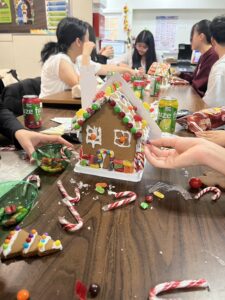 本日は、初めてセントパッツの生徒や先生方と交流をしました。セントパッツの生徒も先生たちもみんな暖かく迎えて下さいました。出会って数分でもう仲良くなっており、各々インスタを交換するなどして楽しい時間を過ごしておりました。また、セントパッツ生とジンジャーブレッドハウスと呼ばれるお菓子の家も作りました。皆んなで協力し合いながら作っており、そしてどのグループも笑顔が絶えずとても楽しい時間を過ごしておりました。